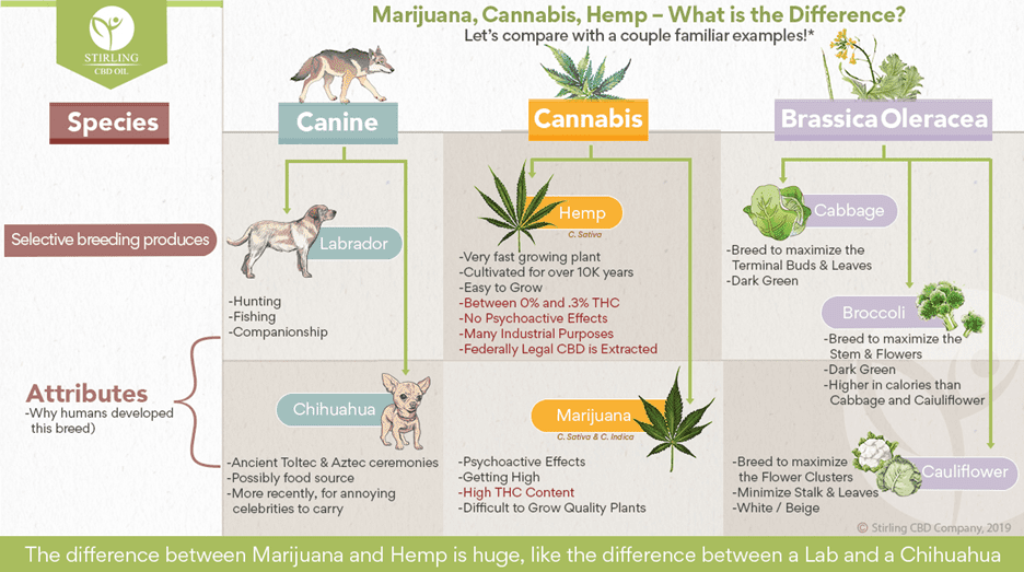 Hemp and Marijuana are simply two breeds of Cannabis, just as Labradors and German Shepherds are breeds of Canine while broccoli and cauliflower are breeds of Brassica Oleracea.