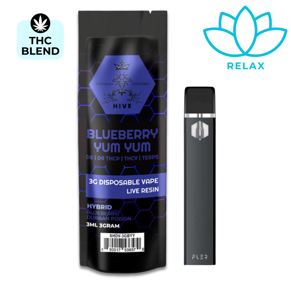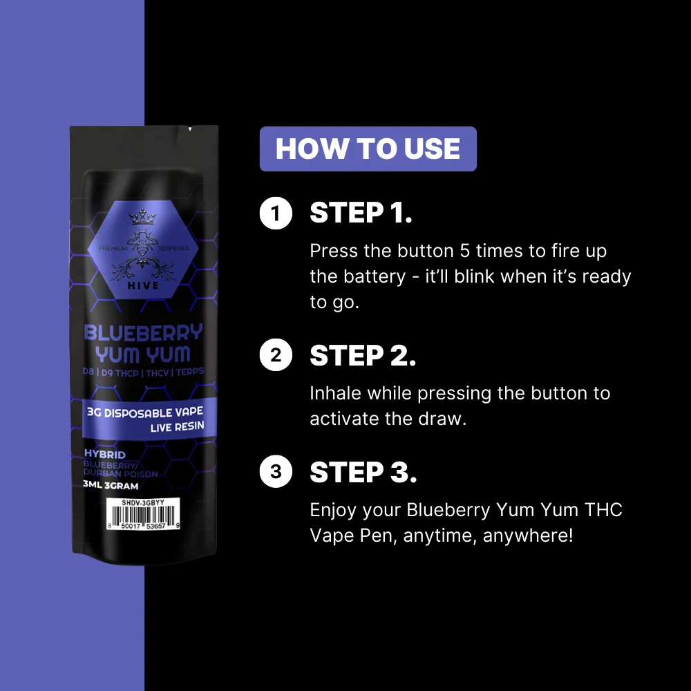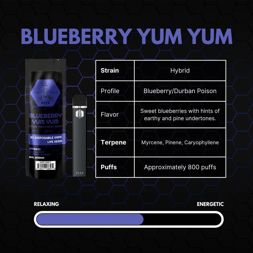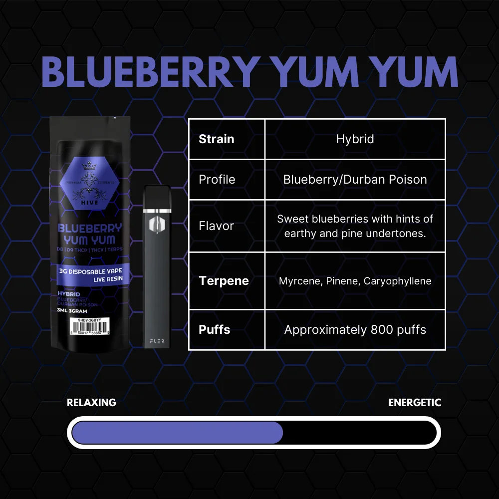 Enjoy Blueberry Yum Yum Vape Pen, blending sweet blueberry and tangy raspberry flavors with a premium THC mix. Featuring Blue Dream and Raspberry Kush, it delivers relaxation and euphoria, perfect for mood enhancement and creative inspiration.- Immerse yourself in a burst of blueberry bliss.