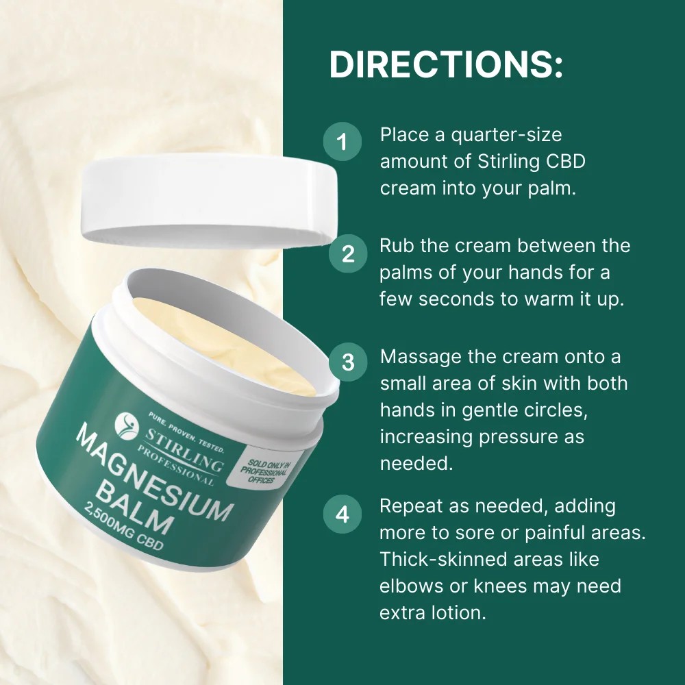 Magnesium Balm combines premium CBD with magnesium to target sore muscles, reduce inflammation, and promote joint relief. Perfect for patient recovery, this cream supports muscle relaxation and overall body balance.- Relieves muscle cramps fast: Dead Sea magnesium chloride absorbs quickly to relax tight muscles and ease cramping.