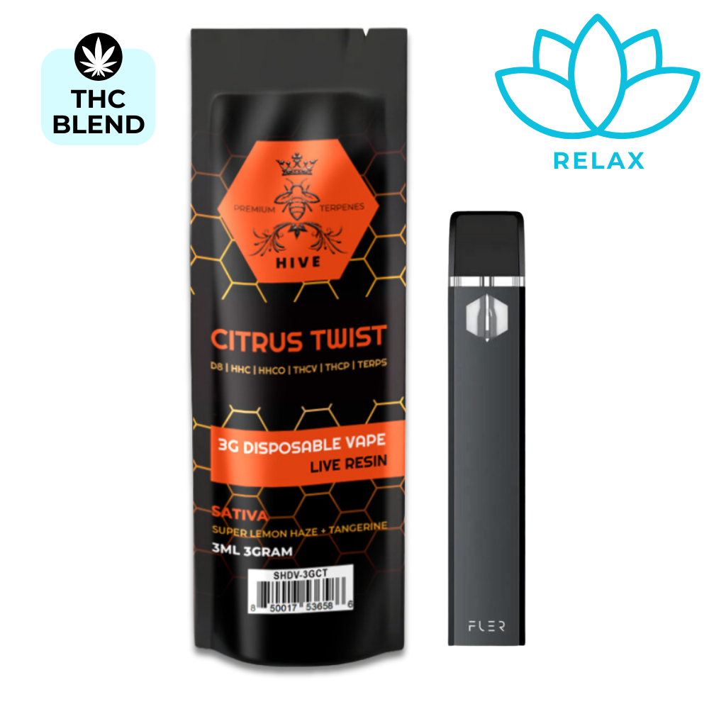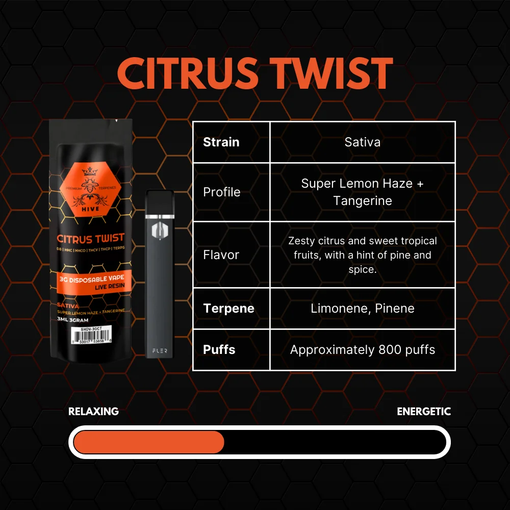 Indulge in Citrus Twist vape, bursting with tropical pineapple and tangerine flavors, complemented by a signature THC blend for pure elevation. With a unique combo of Super Lemon Haze and Tangerine, it promises mood regulation and energizing effects.- Combat overwhelm and spark creativity.