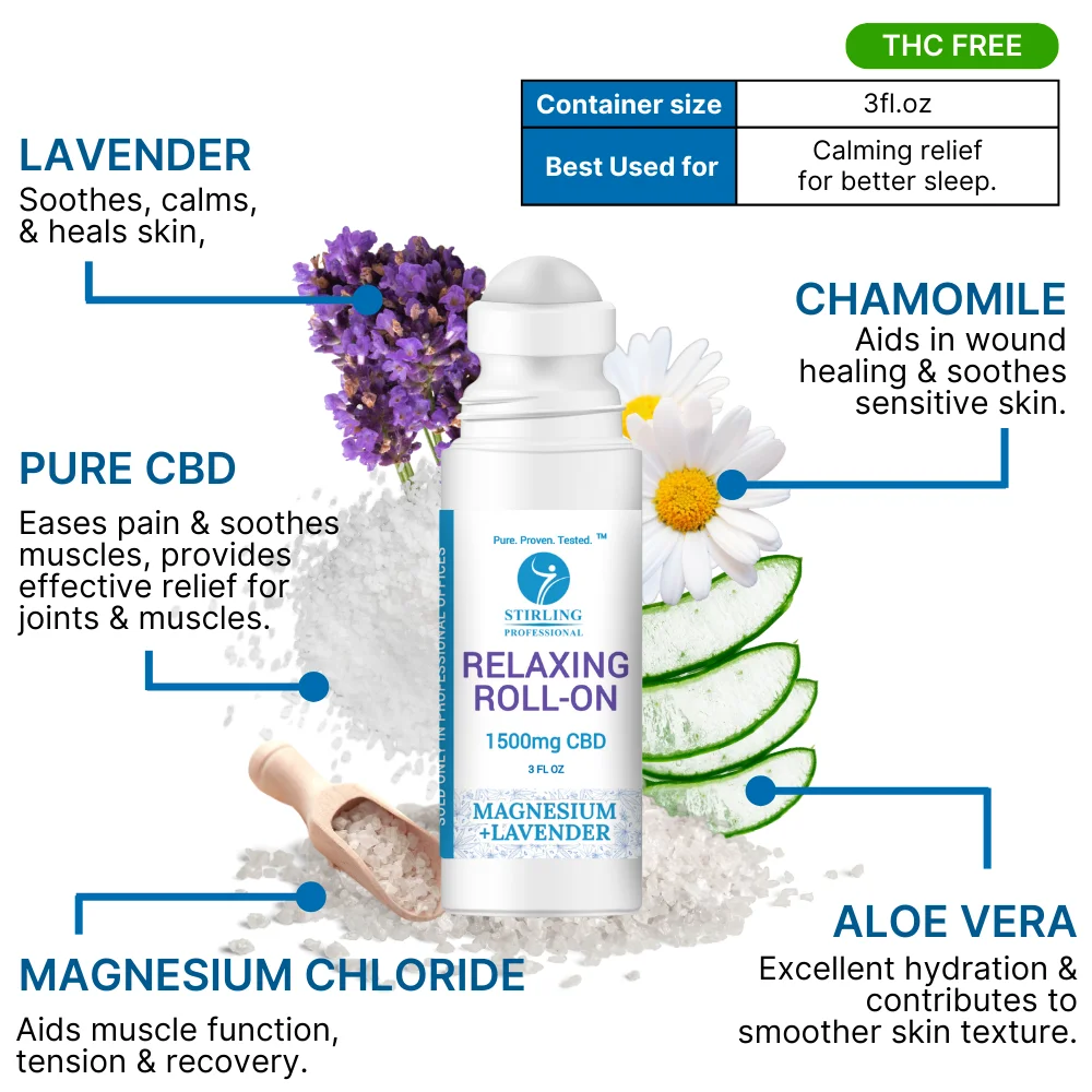 Experience fast, targeted relief with Relaxing Roll-On—a blend of Dead Sea magnesium, CBD isolate, aloe vera, chamomile, and lavender. This cooling roll-on soothes tense muscles, eases stress, and supports deep relaxation for post-workout, workdays, or nightly wind-downs.- Cools & soothes on contact: 1500mg CBD isolate eases muscle discomfort and promotes total-body relaxation.